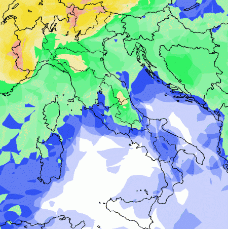 Probabilità di pioggia elevata o molto elevata su Alpi, Prealpi e settori di pianura settentrionali, media sul resto del nord, la Toscana e le aree interne del centro. Sul resto d’Italia, vale a dire al sud e sulle Isole, probabilità di pioggia bassa o del tutto nulla dove vedete il bianco sulla mappa.