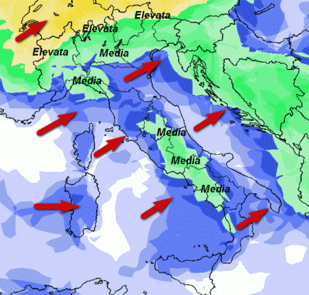 La probabilità di avere precipitazioni viene al momento giudicata elevata sulle Alpi, media su gran parte del settentrione e le aree interne dell’Italia centrale. Altrove la medesima probabilità viene giudicata bassa o molto bassa.