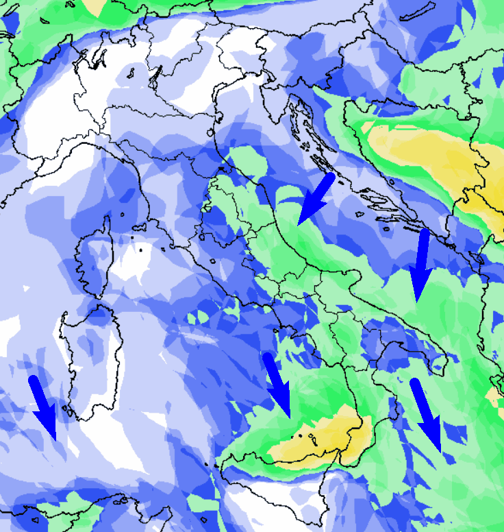 Come già anticipato, le precipitazioni riguarderanno essenzialmente il meridione oltre al versante orientale della Penisola e non mancherà anche qualche nevicata sui rispettivi rilievi. Più asciutto e soleggiato risulterà il tempo al nord e lungo il Tirreno, Sardegna compresa.
