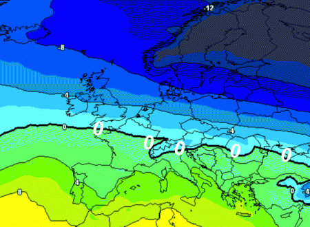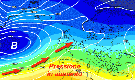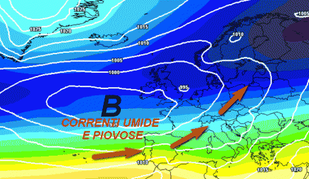 L’aria fredda di matrice orientale passerà molto a nord, alle latitudini dell’Europa settentrionale. Noi verremo invece interessati da correnti umide e temperate da sud-ovest, che faranno capo ad una depressione posta in prossimità del Golfo di Biscaglia.