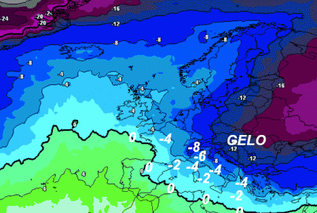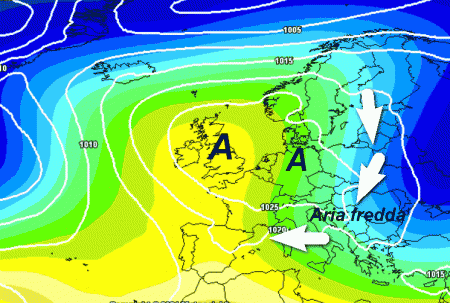 Notiamo l’alta pressione disposta con la sua parte dinamica (quindi calda) tra la Spagna e le Isole Britanniche. Più ad est avremo l’ingerenza di correnti fredde (frecce bianche) provenienti direttamente dall’Europa nord orientale. Come vedete, l’Italia sarebbe interessata in pieno da questo trasporto freddo, con tutte le conseguenze del caso.