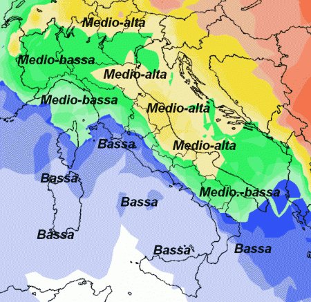 Sulle regioni nord-orientali e il versante adriatico questa probabilità viene al momento giudicata MEDIO-ALTA, ovvero tra il 55 e il 60%. Sul nord-ovest, l’alto Tirreno e parte del meridione peninsulare la medesima probabilità viene giudicata MEDIO-BASSA, ovvero tra il 40 e il 45%. Sulle altre aree viene invece giudicata BASSA, ovvero sotto il 40%.