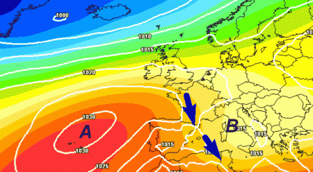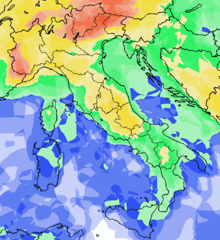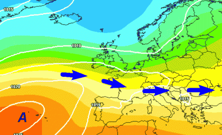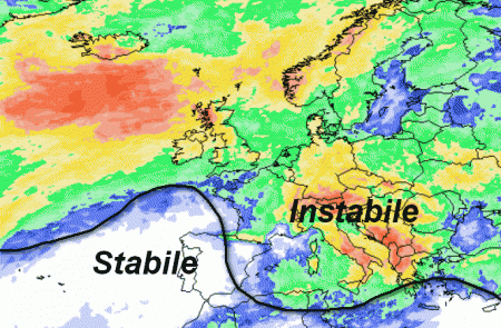 Il tempo stabile e anticiclonico sarà di competenza della Penisola Iberica e del Vicino Atlantico. Da noi campeggerà l’instabilità con rovesci e temporali abbastanza frequenti da nord a sud, in un contesto termico non caldo.