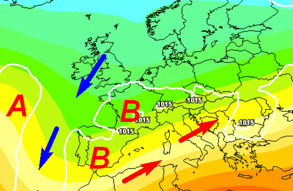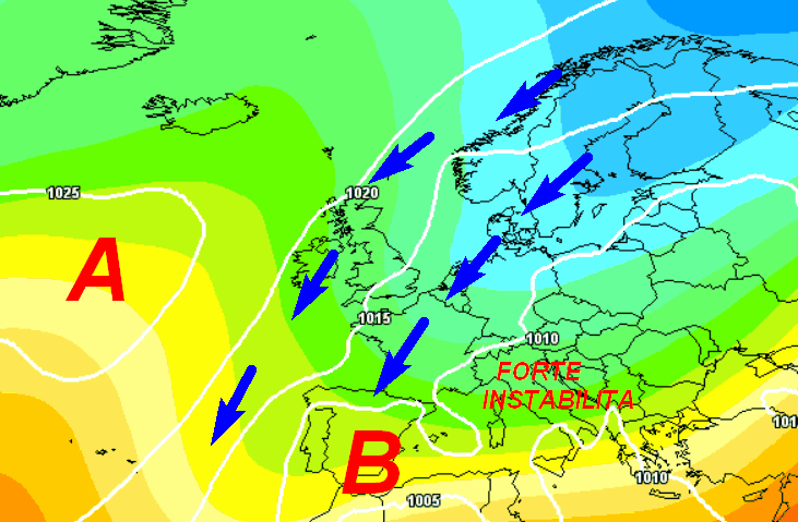 Guardate dove verrà spedita l’alta pressione, quasi in mezzo all’Oceano. Una massiccia dose di aria fredda scenderà da nord-est sfruttando la spalla orientale della figura stabilizzante (frecce blu); sul Mediterraneo centro-occidentale prenderà di conseguenza vita una vasta depressione che dispenserà piogge e rovesci a carattere sparso sull’Italia, con nevicate in montagna.