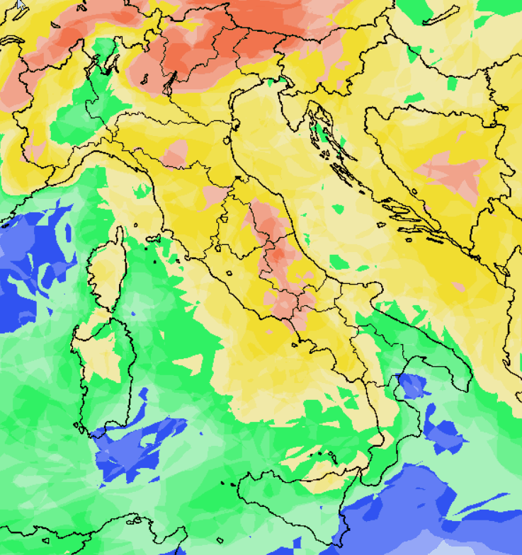 Praticamente tutta a nostra Penisola sarà abbracciata da una probabilità di pioggia MEDIA, che diverrà ELEVATA dove vedete il colore tendente al rosso.