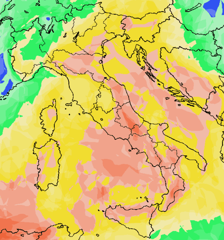 Sul fronte dei fenomeni attesi, ecco la mappa della probabilità di pioggia a scala italica valida per giovedi 29 febbraio. Vi ricordiamo che: in blu probabilità di pioggia bassa (sotto al 25%), in verde medio-bassa (fra 25 e 50%), in giallo medio-alta (fra 50 e 75%) e in rosso alta o molto alta” (oltre il 75%).