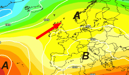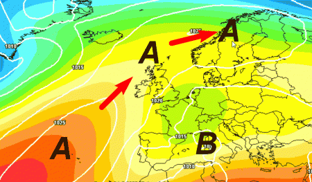 L’alta pressione delle Azzorre seguiterà a puntare a nord verso la Scandinavia, con un ponte che passerà attraverso le Isole Britanniche. Da noi resterà attiva una vasta depressione con tempo instabile ed assolutamente non caldo.