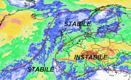 Fin tanto che l’alta pressione delle Azzorre continuerà a puntare verso latitudini settentrionali (freccia rossa), la stabilità in Italia sarà praticamente impossibile.
