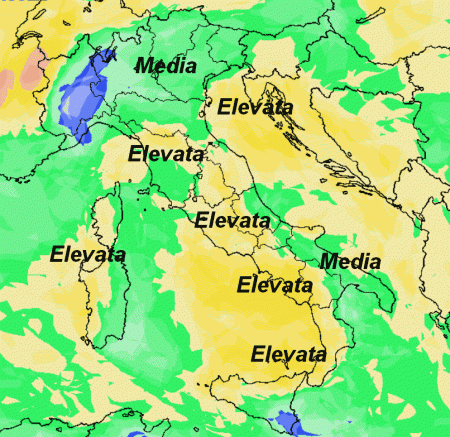 Tranne pochissime aree, gran parte della nostra Penisola avrà una probabilità di pioggia tra il medio e l’elevato, dove vedete il colore giallo.