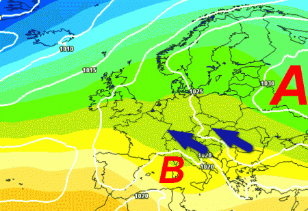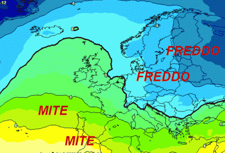 Un vasto anticiclone dovrebbe chiudere il flusso atlantico in favore di masse d’aria fredda ed instabili provenienti dall’est europeo. Le temperature previste sulla mappa si riferiscono all’altezza isobarica di 850 hpa, in linea di massima 1500 metri. Notate l’Europa centro-orientale con termiche alla medesima quota al di sotto dello zero, mentre più ad ovest vigerà un clima decisamente più mite.