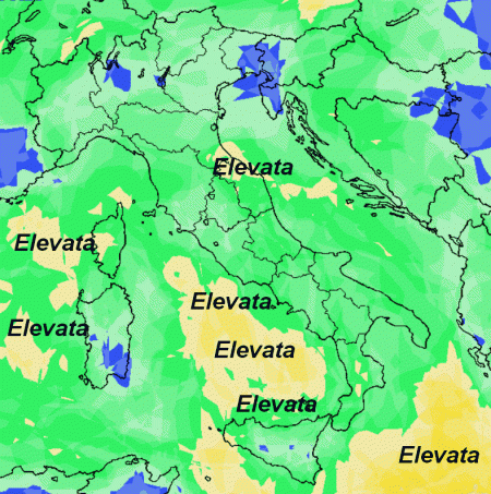 Punte con probabilità di pioggia elevata nelle aree colotare in giallo. Per il resto l’Italia sarà avvolta da una probabilità di pioggia media e solo in pochissime aree sarà bassa (dove vedete il colore blu).