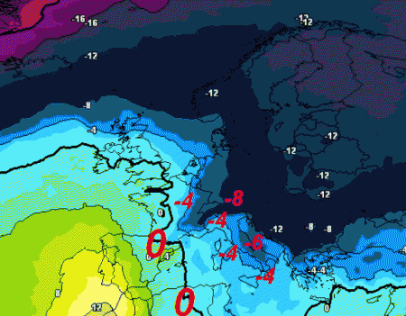 Si notano isoterme alla medesima quota sull’Italia comprese tra -2° delle Isole e -6° del medio Adriatico, fino ad arrivare a -8° sulle Alpi orientali. Le probabilità di realizzo di questo scenario sono comprese tra 30 e 40%, quindi probabilità ancora medio-basse.