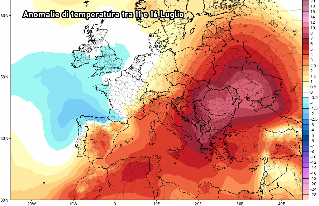 Anomalie notevoli nel periodo tra 11 e 16 Luglio: oltre 10°C di sopra media sull’est Europa, mentre sul tacco d’Italia spicca un’anomalia, su un periodo di 5 giorni, di circa 7-8°C oltre la media.