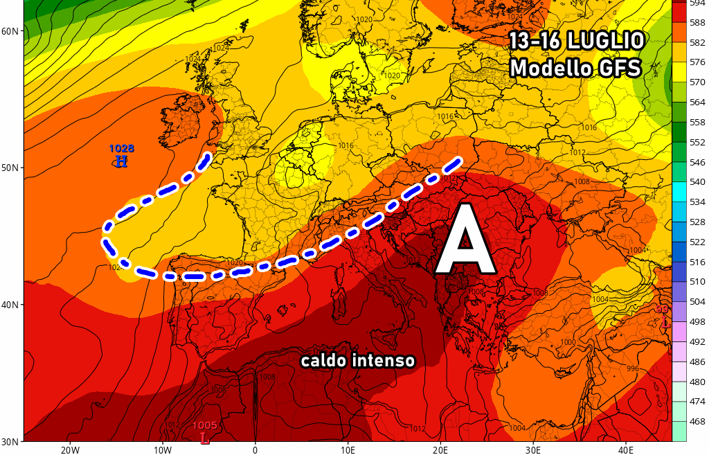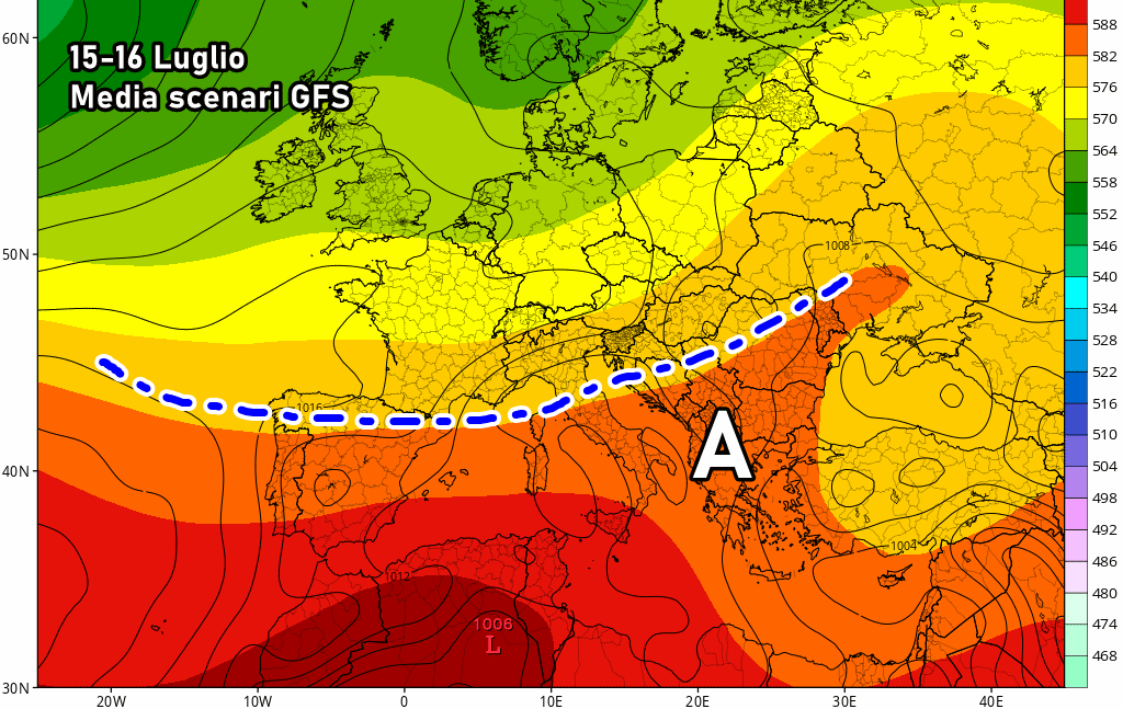 Anche la media degli scenari di GFS propone l’abbassamento di latitudine dei flussi atlantici attorno a metà mese. Il caldo più intenso, di conseguenza, potrebbe concentrarsi al centro-sud e sulle isole.