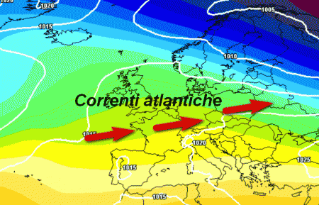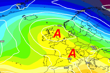 Se paragoniamo le due mappe, si nota un evidente sgonfiamento dell’alta pressione ad opera di correnti atlantiche ancora deboli, ma che potrebbero fare il loro ingresso sull’Europa centrale e marginalmente sul nord Italia.