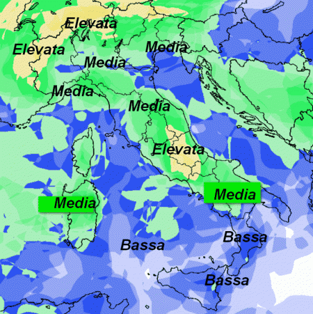 Sulle Alpi e nelle aree interne del centro la medesima probabilità viene giudicata al momento ELEVATA. Viene invece giudicata MEDIA dove vedete il colore verde e BASSA dove campeggia il colore blu.
