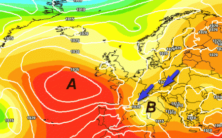 Cosa succederà in sostanza? Si alzerà in maniera spropositata la pressione sul Vicino Atlantico e di rimando tenderà a deprimersi il Mediterraneo e l’Italia, divenendo bersaglio di aria fresca da nord-est (frecce blu).