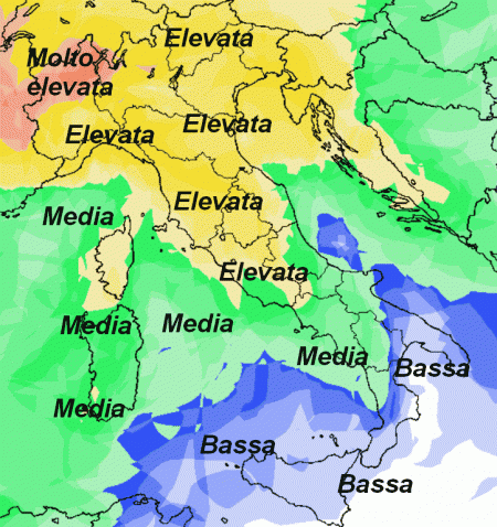 Probabilità di pioggia ELEVATA su buona parte del nord e del centro, addirittura MOLTO ELEVATA sull’arco alpino occidentale. Probabilità MEDIA sulla Sardegna e parte del meridione, BASSA solo all’estremo sud e sulla Sicilia.