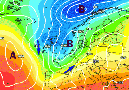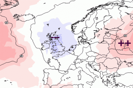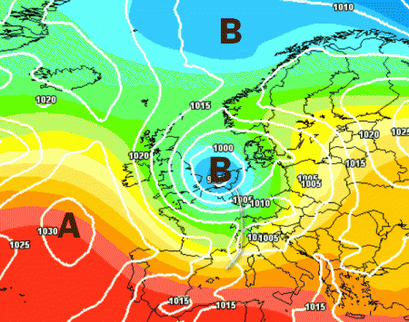 Come si nota qui sopra pressioni più basse della norma si collocherebbero a ridosso delle Isole Britanniche, spingendosi sin al limite dell’area mediterranea; tutto questo sottende un potenziale peggioramento del tempo anche sul nostro Paese, soprattutto sulle nostre regioni settentrionali, come ben evidenziato anche dalle mappe seguenti, previste per lo stesso intervallo temporale: