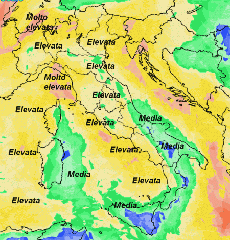 Probabilità di pioggia ELEVATA se non addirittura MOLTO ELEVATA su vaste aree della nostra Penisola. Dove vedete il colore verde la medesima probabilità viene al momento giudicata MEDIA.