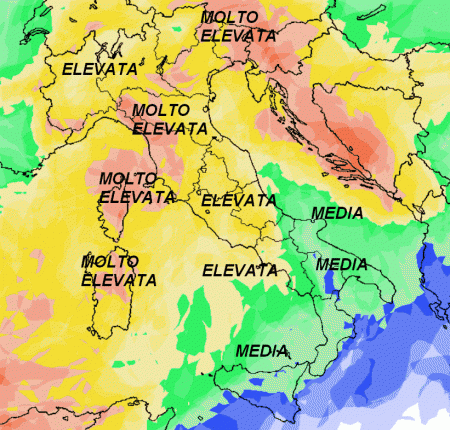 Su tutto il centro-nord, la Campania e la Sardegna, la probabilità di pioggia viene al momento giudicata ELEVATA o MOLTO ELEVATA. Sul restante meridione la medesima probabilità viene giudicata MEDIA; più BASSA solo sulla Sicilia meridionale e lo Ionio.