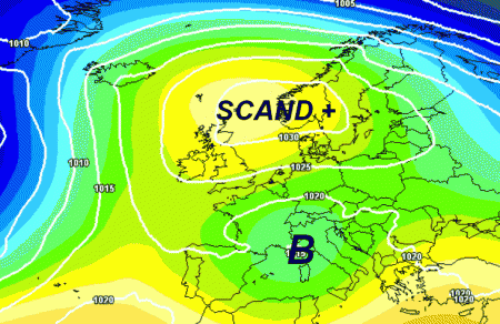 Volgendo lo sguardo ulteriormente a prua ed arrivando a lunedi 27 febbraio, la media degli scenari americana mostra una situazione da SCAND POSITIVO, ovvero con alta pressione sulla Scandinavia e bassa pressione in sede italica: