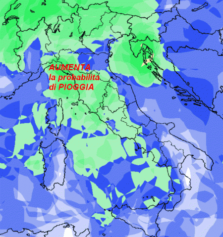 Probabilità di pioggia in aumento dove vedere il colore verde; resterà invece bassa la medesima probabilità nelle aree colorate in blu.