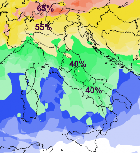 Ed ecco quella relativa al rischio di neve: discreta sulle Alpi e al più in Appennino (in giallo 55%, in verde 40%, in azzurrino 20-30%), modesta ma non del tutto da escludere in pianura al nord.