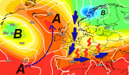 Notate come tutta l’Europa centro-settentrionale sia abbracciata da una vistosa circolazione depressionaria con clima fresco e molto instabile. Le regioni settentrionali si troveranno al limite, ma potrebbero beneficiare lo stesso di transiti temporaleschi da ovest verso est (frecce blu).