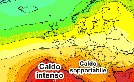 Prendendo sempre per buona l’isoterma + 20° a 1500 metri come confine tra caldo intenso e sopportabile, notiamo sulla nostra Penisola temperature alla medesima quota comprese tra 16 e 17°; in altre parole, farà ovviamente caldo, ma nulla di esagerato da nord a sud. Inoltre, qualche temporale si farà vedere al nord e nelle aree interne dell’Italia centrale.