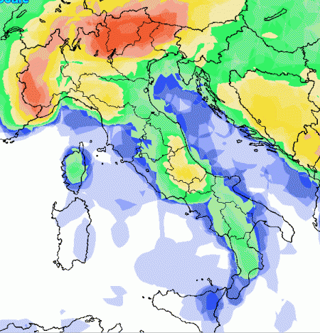 Al nord probabilità di pioggia molto elevata sulle Alpi. Probabilità di pioggia elevata anche nelle aree interne dell’Italia centrale, più bassa o nulla sulle Isole ed estremo sud.