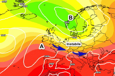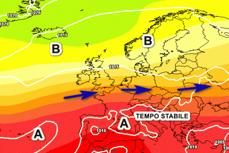 Come si può notare dalla cartina, le regioni settentrionali resteranno sotto il tiro dell’aria più fresca e moderatamente instabile proveniente dall’Atlantico (frecce blu), con rischio di temporali e temperature non eccessivamente alte. Il resto d’Italia godrà invece di situazioni meteorologiche nettamente migliori, ma senza punte di caldo eccessivo, considerando che saremo ancora nel periodo più caldo dell’anno.
