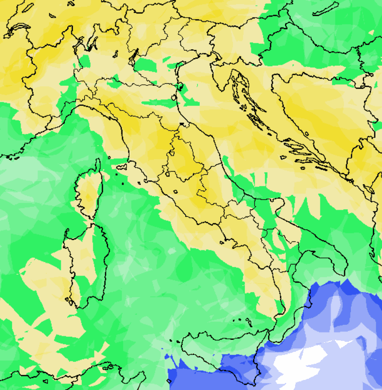 A tal proposito vi mostriamo la mappa della probabilità di pioggia a scala italica valida per la medesima giornata, ovvero martedi 26 marzo. Vi ricordiamo che: In blu probabilità di pioggia bassa (sotto al 25%), in verde medio-bassa (fra 25 e 50%), in giallo medio-alta (fra 50 e 75%) e in rosso alta o molto alta” (oltre il 75%).