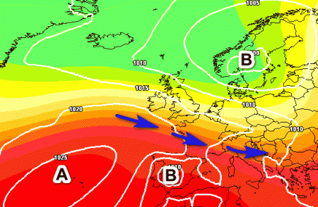 Le frecce blu nella mappa indicano la prevalenza di venti occidentali o nord-occidentali che si faranno notare soprattutto al nord e su parte delle regioni centrali con qualche fenomeno di instabilità. Il tempo risulterà invece più stabile sulle Isole e al meridione.