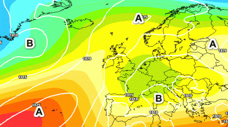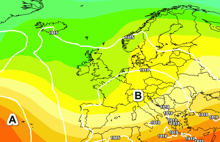 La cosa che balza subito all’occhio è la latitanza quasi completa dell’alta pressione delle Azzorre che si manterrà molto ad ovest, al largo in Atlantico. Da noi vigerà una figura depressionaria che, come vedete dalla mappa, abbraccerà tutta l’Italia.
