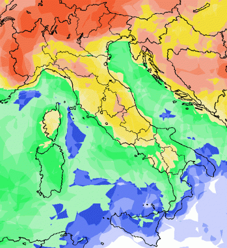 Cosa notiamo? Una probabilità di pioggia molto elevata al nord, specie sulle Alpi e le alte pianure. Elevata sul resto del settentrione e nelle aree interne del centro, media o bassa sul restante territorio italico.