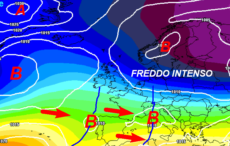 Osservate la posizione dell’alta pressione, che in questo frangente sarà molto defilata a nord-ovest. Più ad est permarrà un blocco gelido sotto le spoglie di una vasta depressione che dispenserà neve e gelo sull’Europa nord orientale. Da noi si aprirà un corridoio di correnti occidentali più miti che indirizzerà una serie di perturbazioni verso il bacino centro-occidentale del Mediterraneo e l’Italia. In altre parole, ci attende un tempo spesso piovoso, che sulle regioni settentrionali potrebbe dare anche bianche sorprese stante la vicinanza al lago gelido presente oltralpe.