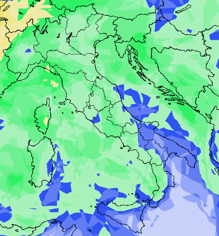 Dalla cartina si evince come gran parte d’Italia abbia una probabilità media di avere precipitazioni, che diverrà bassa solo su alcune aree del meridione, sulla Sardegna orientale e parte del medio Adriatico.