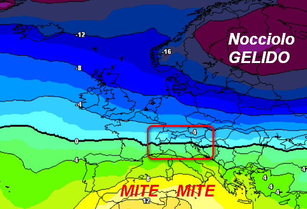 Ecco il nocciolo gelido posizionato sul nord-est Europa, con punte al ribasso a 1500 metri al di sotto di -15°. Notate come il settentrione italiano si trovi al confine tra la sopracitata circolazione fredda e l’alito più mite occidentale che interesserà il Mediterraneo e l’Italia centro-meridionale. In altre parole, non si possono escludere a priori nevicate a bassa quota sull’alta Italia, oltre ovviamente alle Alpi, anche se il tutto andrà rapportato alla dose di freddo che effettivamente riuscirà a filtrare sui nostri versanti.