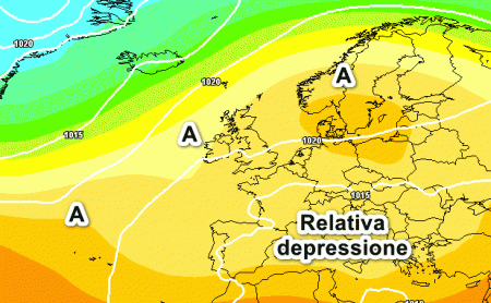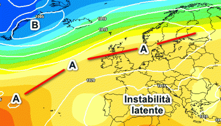 Con le righe rosse abbiamo indicato la spinta dell’alta pressione delle Azzorre che se ne andrà ancora verso nord-est, snobbando l’Italia e il Mediterraneo. I geopotenziali tenderanno un po’ a salire: ciò dovrebbe garantire una situazione meno perturbata, che comunque si manterrà nei ranghi di un‘instabilità latente. Detto in altri termini, i rovesci ed i temporali potrebbero trasferirsi verso le aree montuose nel pomeriggio, mentre sulle coste il tempo sarà migliore, non escludendo ovviamente la possibilità di sconfinamenti.