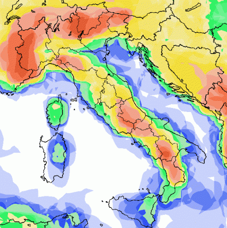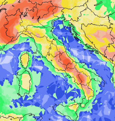 Zone alpine e appenniniche avranno probabilità di pioggia elevata o molto elevata proprio per i motivi di cui sopra. Probabilità di pioggia minore sulle Isole e lungo le coste, in un contesto termico nel complesso gradevole.