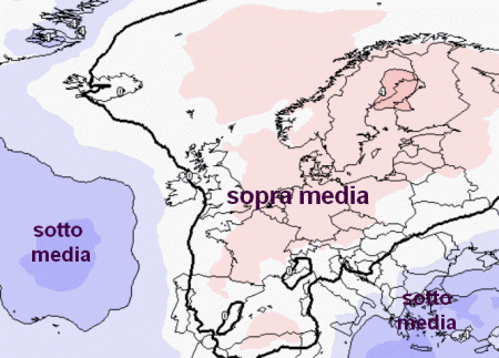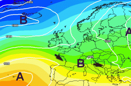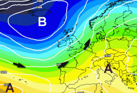 Successivamente le correnti atlantiche proveranno ad insinuarsi da ovest, ma sino alla fine del mese non si prevede un vero peggioramento del tempo, solo qualche disturbo sul nord-ovest, come si vede anche da questa mappa:
