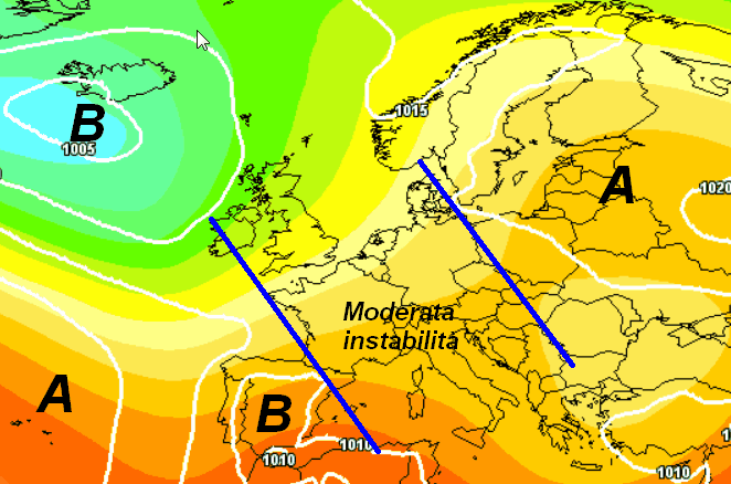 Lo schema barico non si discosterà molto da quello avuto negli ultimi tempi, anche se i geopotenziali tenderanno lentamente ad aumentare, segno che la stagione -seppure con molti ostacoli – sta progredendo verso un quadro più estivo. Notiamo però la reiterata presenza di un canale moderatamente instabile disposto proprio sull’Italia e compreso tra due zone di alta pressione (una ad ovest e l’altra ad est) dove il tempo sarà nettamente più stabile e caldo.