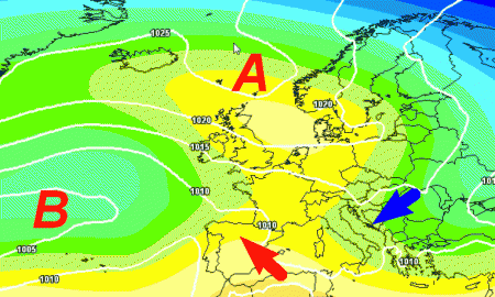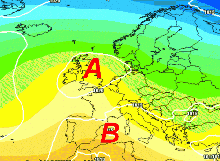 Guardate dove andrà a finire l’alta pressione…addirittura a nord della Scozia. Notate inoltre come il Mediterraneo venga interessato da una confluenza tra aria fredda da est ed aria decisamente più temperata in risalita dal Mediterraneo verso l’Iberia. Questa congiuntura barica darà luogo a condizioni molto instabili sulla nostra Penisola, con rischio di rovesci e temporali alternati comunque a fasi soleggiate. Un tempo quindi non affidabile.