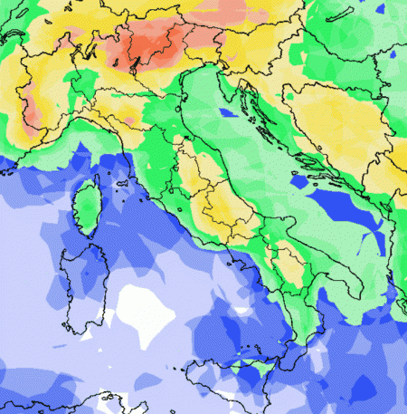 Anche in questo caso, le aree interne e il settentrione saranno interessate da una probabilità di pioggia elevata o molto elevata; più bassa la medesima probabilità sulla Sardegna e sulla Sicilia.