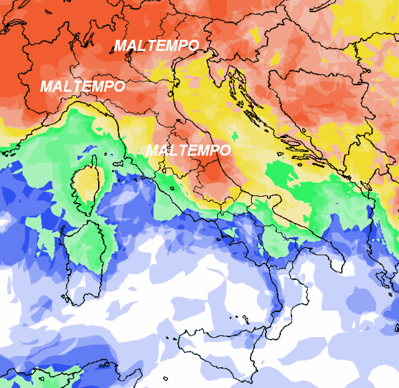 Il colore ROSSO testimonia una probabilità di pioggia ELEVATA o MOLTO ELEVATA, con rischio quindi di ulteriori episodi di maltempo al nord e nelle aree interne dell’Italia centrale. Probabilità di pioggia decisamente più contenuta sulle altre regioni fino ad avere probabilità praticamente NULLA dove vedete il colore bianco sulla mappa, ovvero sulle estreme regioni meridionali.