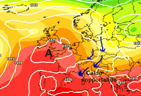 Alta pressione centrata sulla Scandinavia. Sul suo fianco meridionale potrebbe scorrere una goccia fredda che destabilizzerebbe il tempo segnatamente al nord con temporali ad iniziare dalle Alpi.