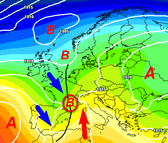 Ecco la lunga perturbazione che entrerà sul Mediterraneo occidentale preceduta da un ventaglio di correnti sciroccali (frecce rosse). Le regioni settentrionali, la Sardegna e le aree dell’alto-medio Tirreno avranno quindi piogge più o meno intense con la neve che cadrà solo a quote elevate sulle Alpi. Le altre regioni saranno ancora in attesa ed in procinto di essere interessate successivamente.