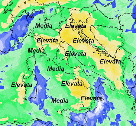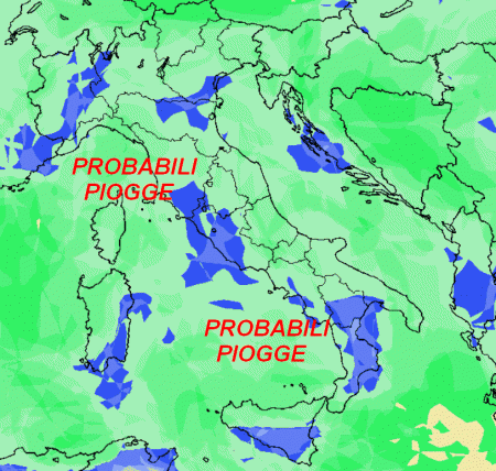 La mappa promette una probabilità di pioggia elevata o media sulla maggior parte della nostra Penisola. Solo limitate aree, quelle colorate in blu, avranno una probabilità di pioggia più bassa.