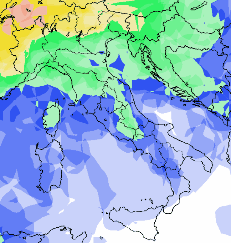 Le aree che presenteranno una probabilità di pioggia media o medio-alta saranno concentrate al nord, sulla Toscana e nelle aree interne del centro. Su tutte le altre regioni avremo una probabilità di pioggia bassa se non del tutto nulla dove vedete il colore bianco. Il contesto termico sarà molto mite e di conseguenza la quota neve sulle Alpi risulterà elevata.